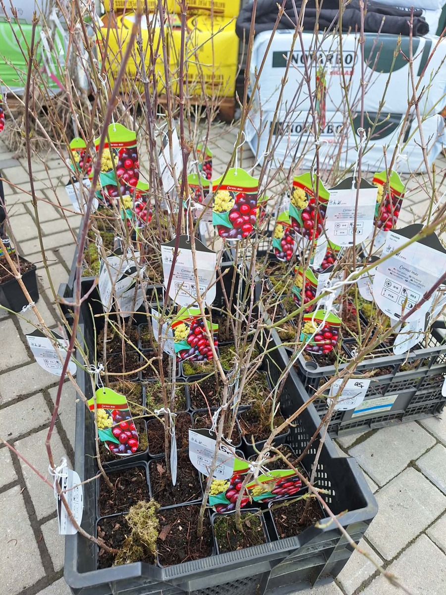 Dřín obecný - Cornus mas patří mezi oblíbené jedlé keře v naších zahradách. Plody dřínu obecného mají jasně červenou barvu a obsahují vysoké množství vitamínu C. Plody dozrávají koncem srpna a sklízíme je až do konce září. Keř dřínu obecného vydrží až do -35°C. Keř není nijak náročný na pěstování a dobře snáší i vyšší nadmořské výšky. Dřín obecný se také vysazuje z důvodu krásných žlutých květů které kvetou již začátkem března. Keř dřínu obecného jsou medonosné a přitahují včely. Sazenice keře dřínu obecného nabízíme dobře zakořeněné v květináči.